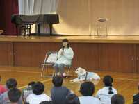 講師は、水出智津(みずいでちづ)さん。水出さんは小学生の頃に視力を失ったそうです。子どもたちは、家事や買い物などをご自身でなさっていることを聞いたり、実際に包丁でキュウリを切る姿を見せていただいたりして、すっかり引き込まれていました。後半は盲導犬のジェシーと歩く様子も見せていただきました。