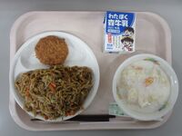 今日の献立:焼きそば、カレーコロッケ、フルーツヨーグルト、牛乳