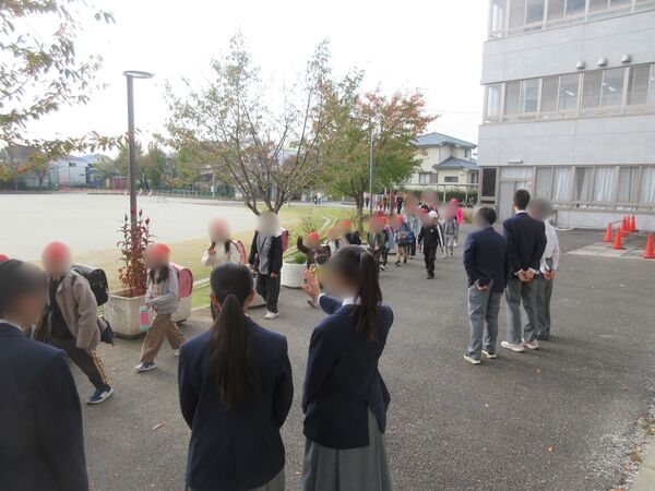 今日の登校時間に合わせて、土屋中学校の生徒さんが栄小であいさつ運動を行いました。栄小を卒業した生徒さんたち。登校してくる子どもたちと元気にあいさつを交わしました。卒業しても「あいさついっぱい」が続いていて、嬉しいです。