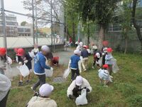 昼休みの時間にたて割り学年で落ち葉拾いを行いました。今日は、2・5年生ペア、3・4年生ペアです。