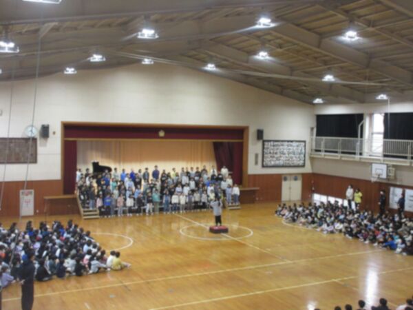 4年生の発表の後、全校で今月の歌「つばさをください」を合唱しました。5・6年生が下のパートを歌い、全校でのハーモニーが体育館中に広がりました。