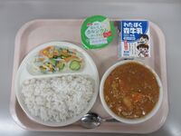 今日の献立:小江戸カレー、麦ごはん、大根サラダ、ヨーグルト、牛乳