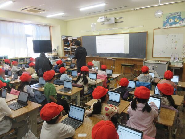 今日は1年生が、先生方やICT支援員さんと一緒にタブレットPCを使って、「さいたま市学習状況調査」の質問紙調査に取り組みました。