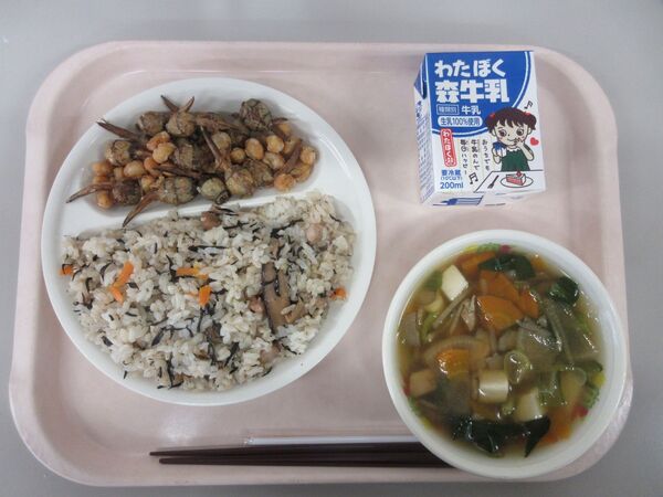 今日の献立:ひじきご飯、くわいと大豆のから揚げ、けんちん汁、牛乳