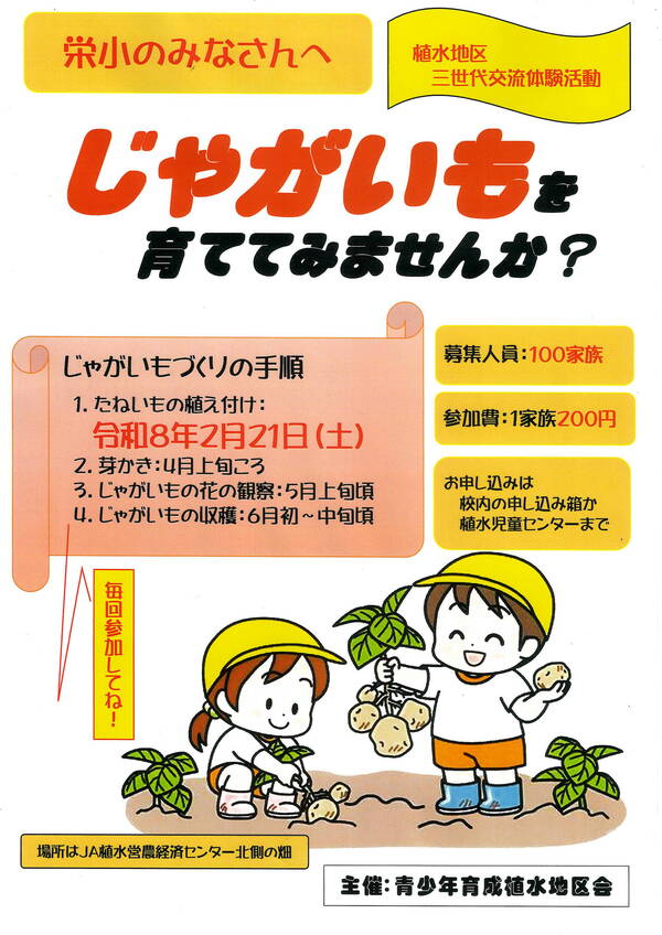 じゃがいもの植え付けから収穫までを体験するものです。興味のあるご家庭はチラシをご確認の上、お申し込みください。