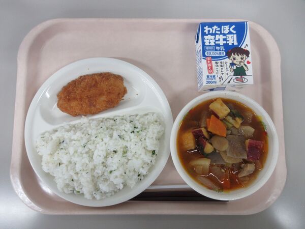 今日の献立:ひろしごはん、ほっけフライ、野菜のうま煮、牛乳