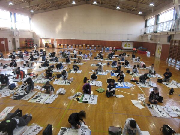 体育館で3年生と5年生が書きぞめの競書会を行いました。3年生は「こうま」5年生は「新たな心」。どちらもバランスのとりにくい難しい言葉ですが、一人ひとりが作品に向き合って書いていました。会心の1枚はできたでしょうか。