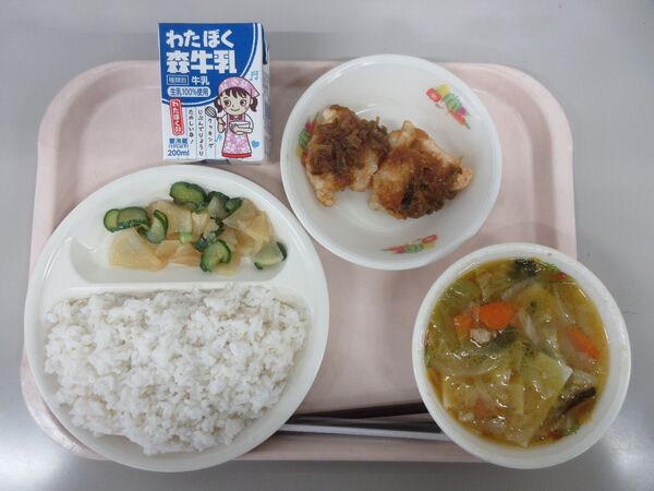 今日の献立:麦ごはん、ユーリンチー、中華漬け、ワンタンスープ、牛乳