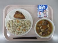 今日の献立:まいたけご飯、ぶりの竜田揚げ、こづゆ、牛乳