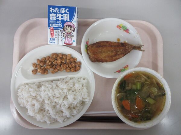今日の献立:麦ごはん、いわしのかば焼き、みそけんちん汁、きなこ大豆、牛乳