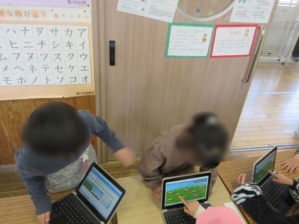 業間休みから3時間目にかけて、1年生と植水保育園、愛徳幼稚園の年長さんとの交流学習がありました。1年生は年長の皆さんに小学校のことを教え、体験させてあげる活動をしました。学習、給食、掃除、昔遊び、タブレットなど、グループごとに一生けん命に教えている姿が見られました。