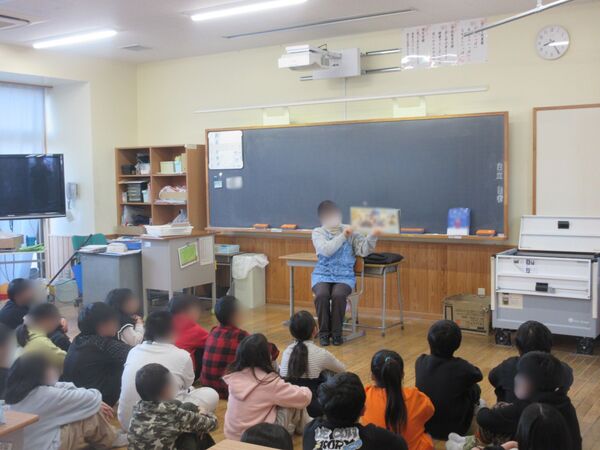 令和8年2月9日(月) 1年生・保育園・幼稚園との交流、図書らびっと読み聞かせ