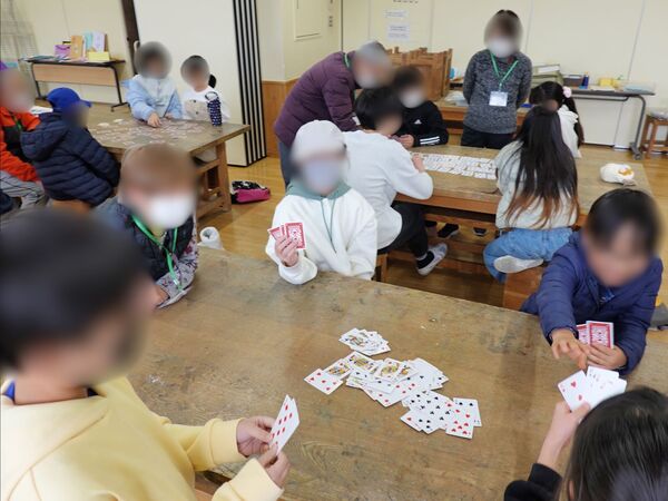 土曜スクールは「トランプ」で楽しい時間を過ごしました。七ならべやババぬき、神経衰弱、一休さんなど各テーブルで好きなゲームを進めて行き、遊びながら会話も自然と盛り上がっていました。一方、放課後スクールは紙芝居「ごちゃまぜカメレオン」の読み聞かせの後、「トランプ」の予定を変更して「郷土かるた」を実施しました。私も一緒になってかるたに熱中してしまい、写真を撮り忘れてしまいました・・・