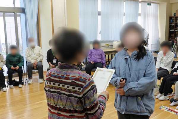 土曜スクールでは、みんなで円になって座り、9ヶ月を振り返って思い出に残ったプログラムのことなど、一人ひとりに感想を述べてもらいました。その後、修了証の授与式を行いました。1度も休まずに全出席した児童も5名おり、修了証と皆勤賞の2枚の賞状を受け取り、にっこり笑顔です。式を終えたあとは、春のようなポカポカ陽気の中で、1時間たっぷりスタッフと一緒に外遊びを楽しみました。