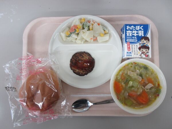今日の献立:子どもパンスライス、ハンバーグ、ポテトサラダ、ABCスープ、牛乳